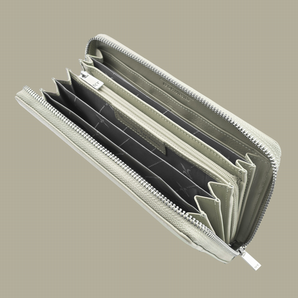 1 RFID Hacker Protection, 3 Notenfächer, 12 Kreditkartenfächer, 2 Kreditkartenfächer im Steckfach, 1 Steckfach mit Klarsichtfenster, 1 Münzfach mit RV und Falte, 1 Fach für Einkaufswagen-Jeton, 1 Münze für den Einkaufswagen, 1 Schlüsselfach, 2 Steckfächer