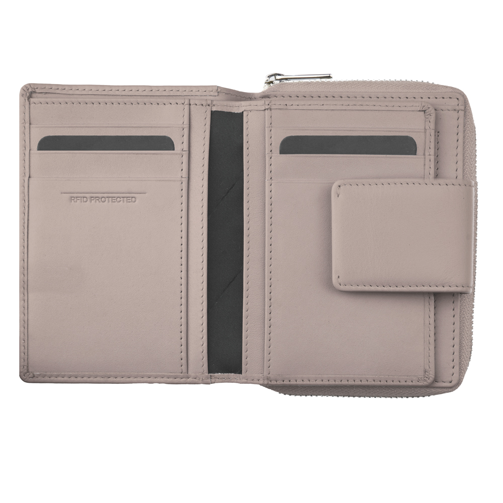 1 RFID Hacker Protection, 12 Kreditkartenfächer, 1 Fotofach, 1 Münzfach geteilt, mit RV, 1 Notenfach, 6 Steckfächer, 1 Sicherheitsverschl. mit Druckknopf, außen, 1 Steckfach aussen