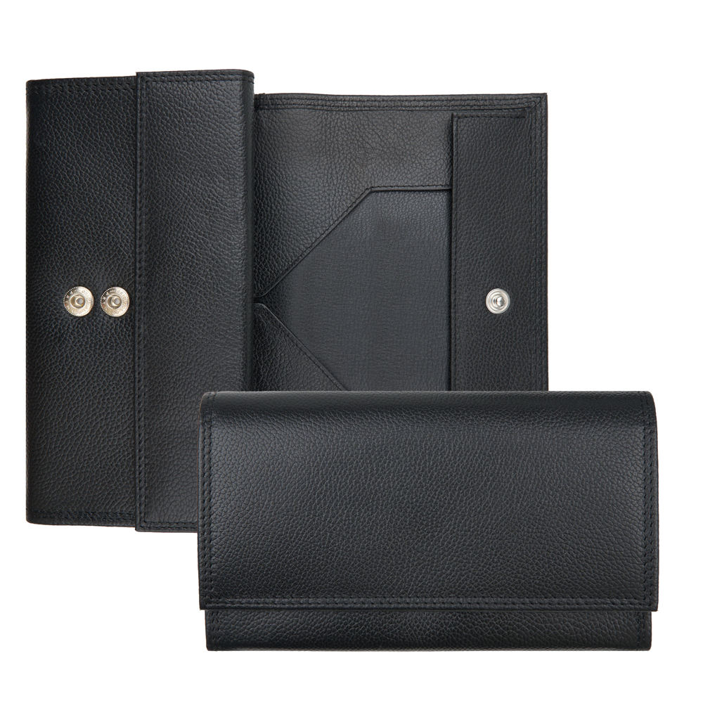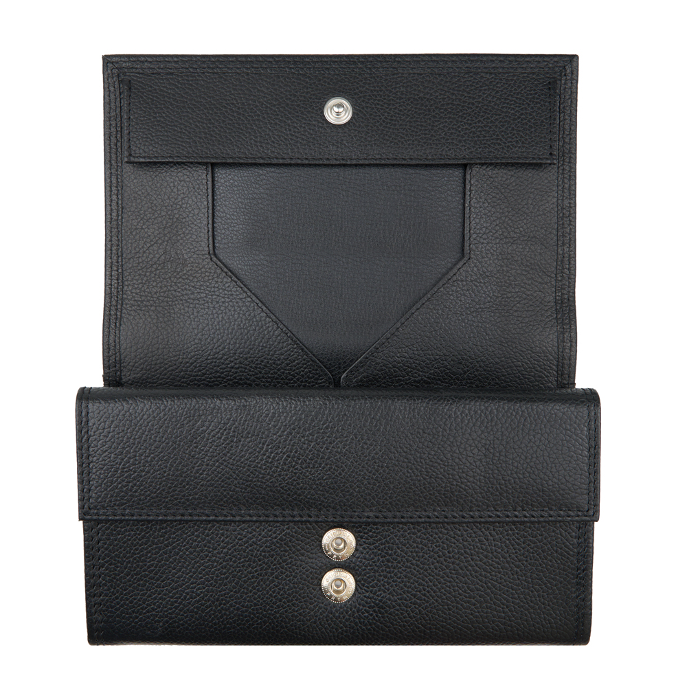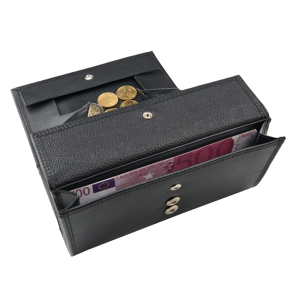6 Notenfächer XL , 1 Münzfach mit Schüttrand, 2 Steckfächer, 1 Steckfach aussen, 1 Vorfach mit Druckknopf, 1 Klarsichtfach, 2 Druckknöpfe Marke Prym , zusätzliches Fach mit Klettverschluss. Doppelsteppung mit Koban-Faden