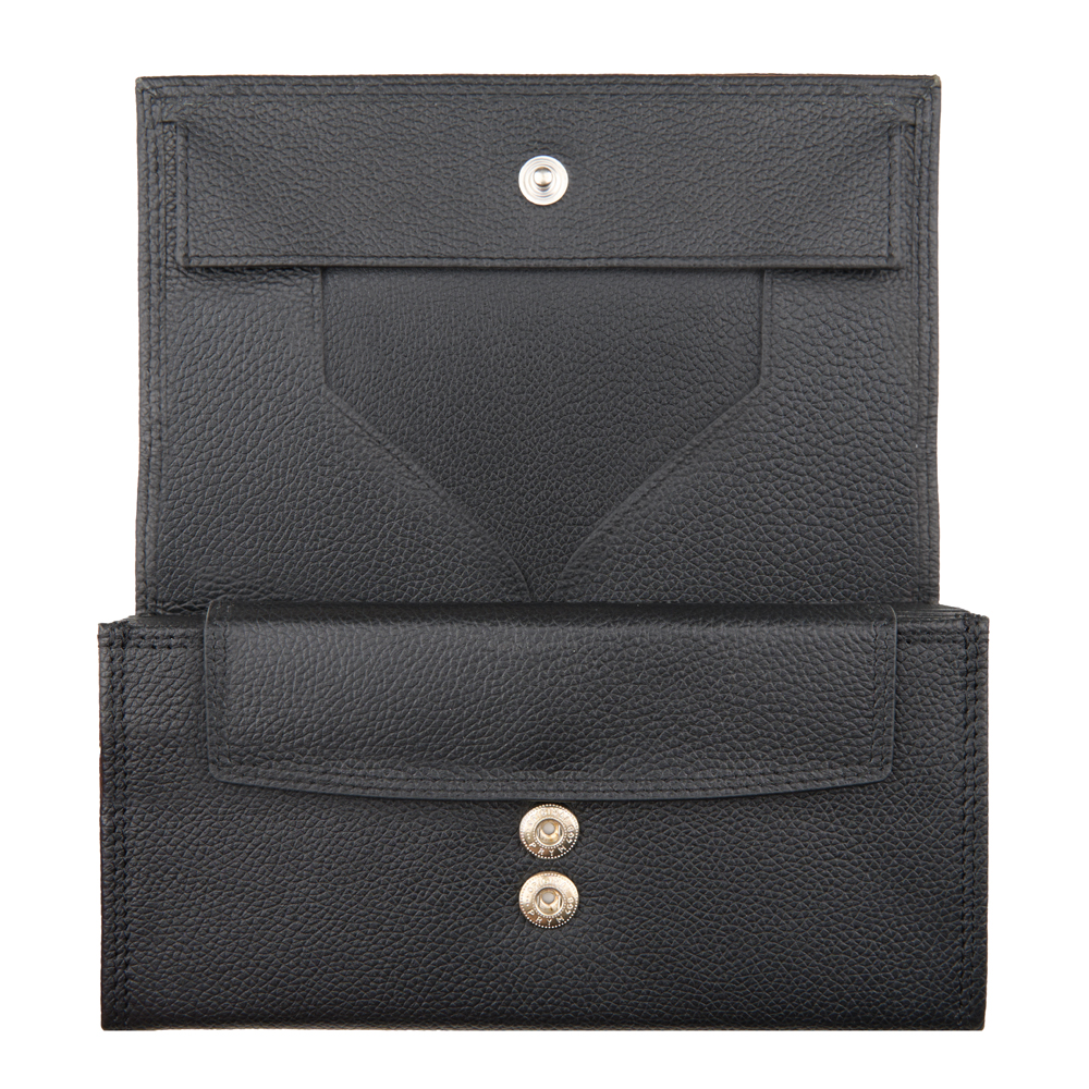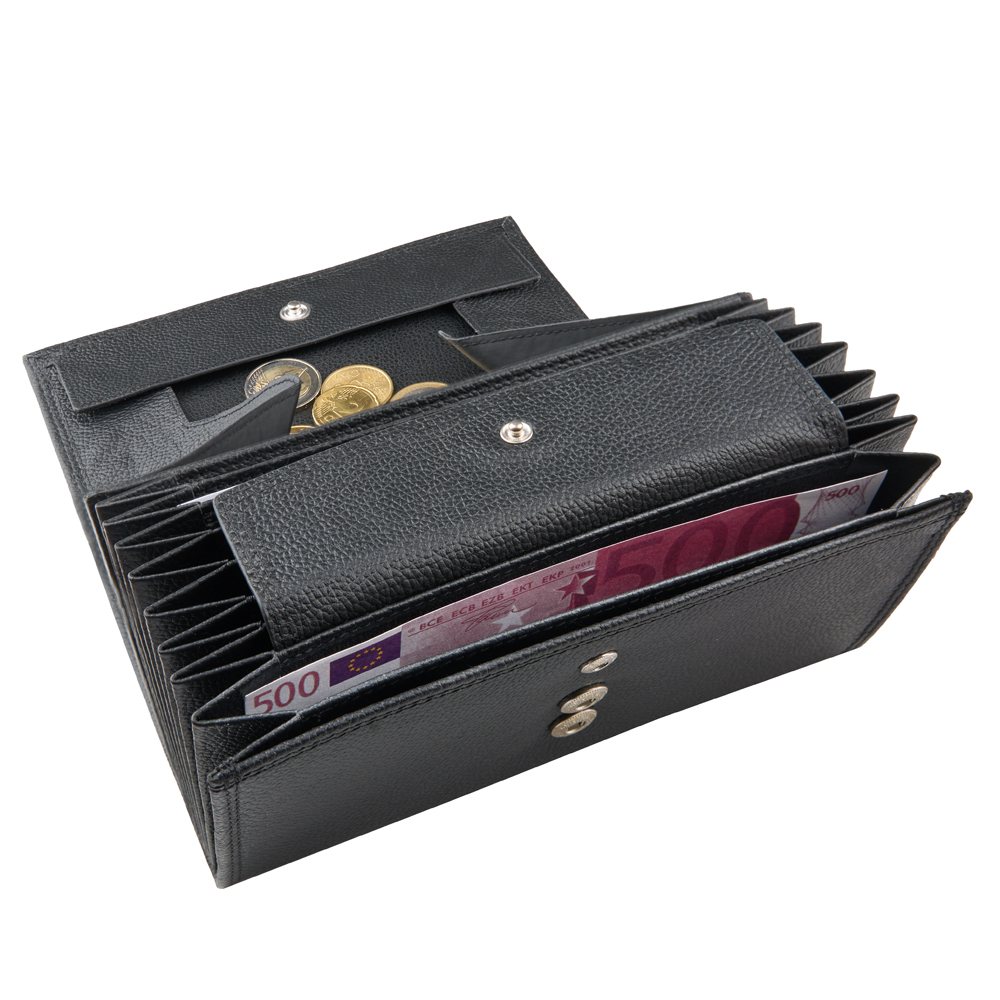 7 Notenfächer XL , 1 Münzfach mit Schüttrand, 2 Steckfächer, 1 Steckfach aussen, 1 get.Vorfach mit Druckknopf, 2 Druckknöpfe Marke Prym , Doppelsteppung mit Koban-Faden