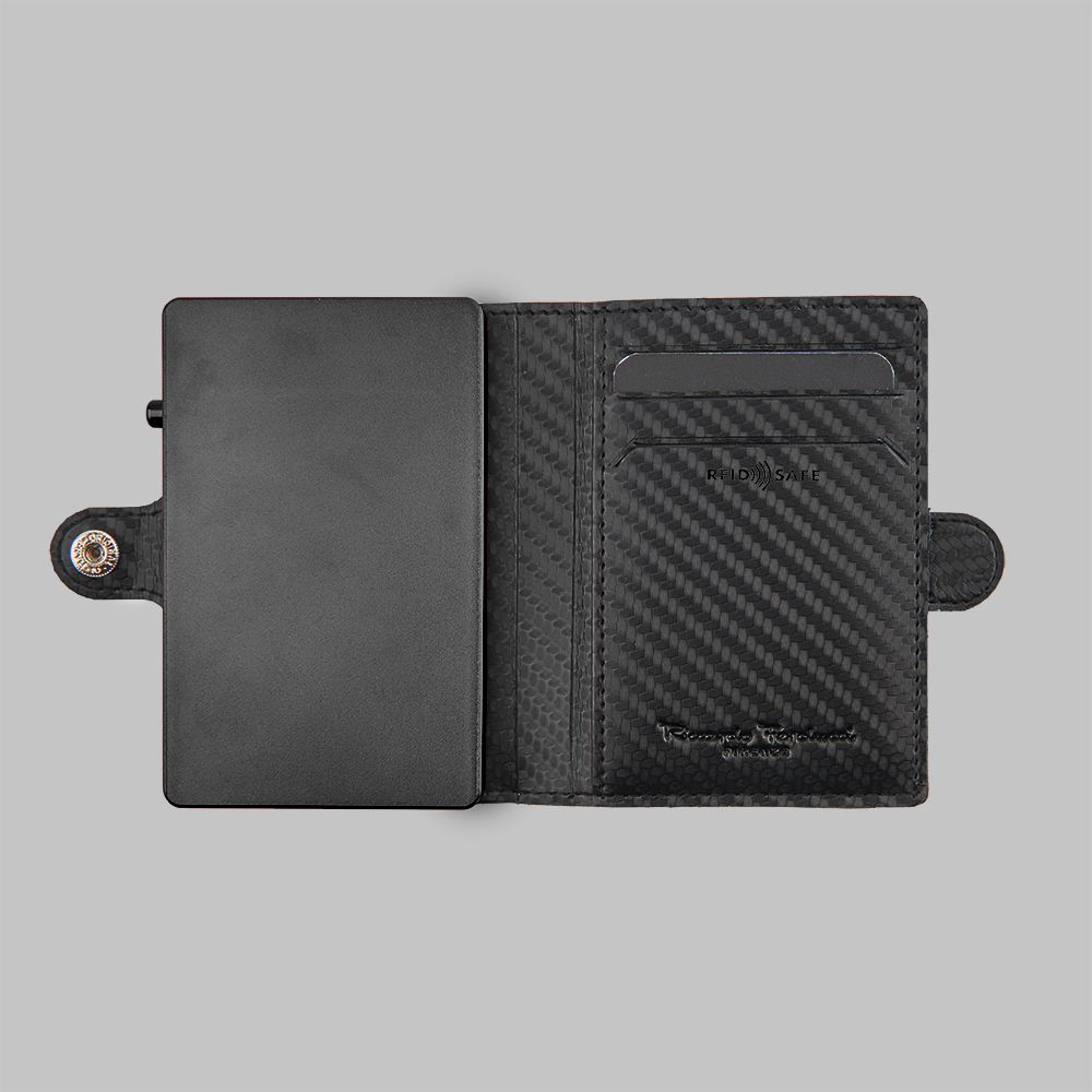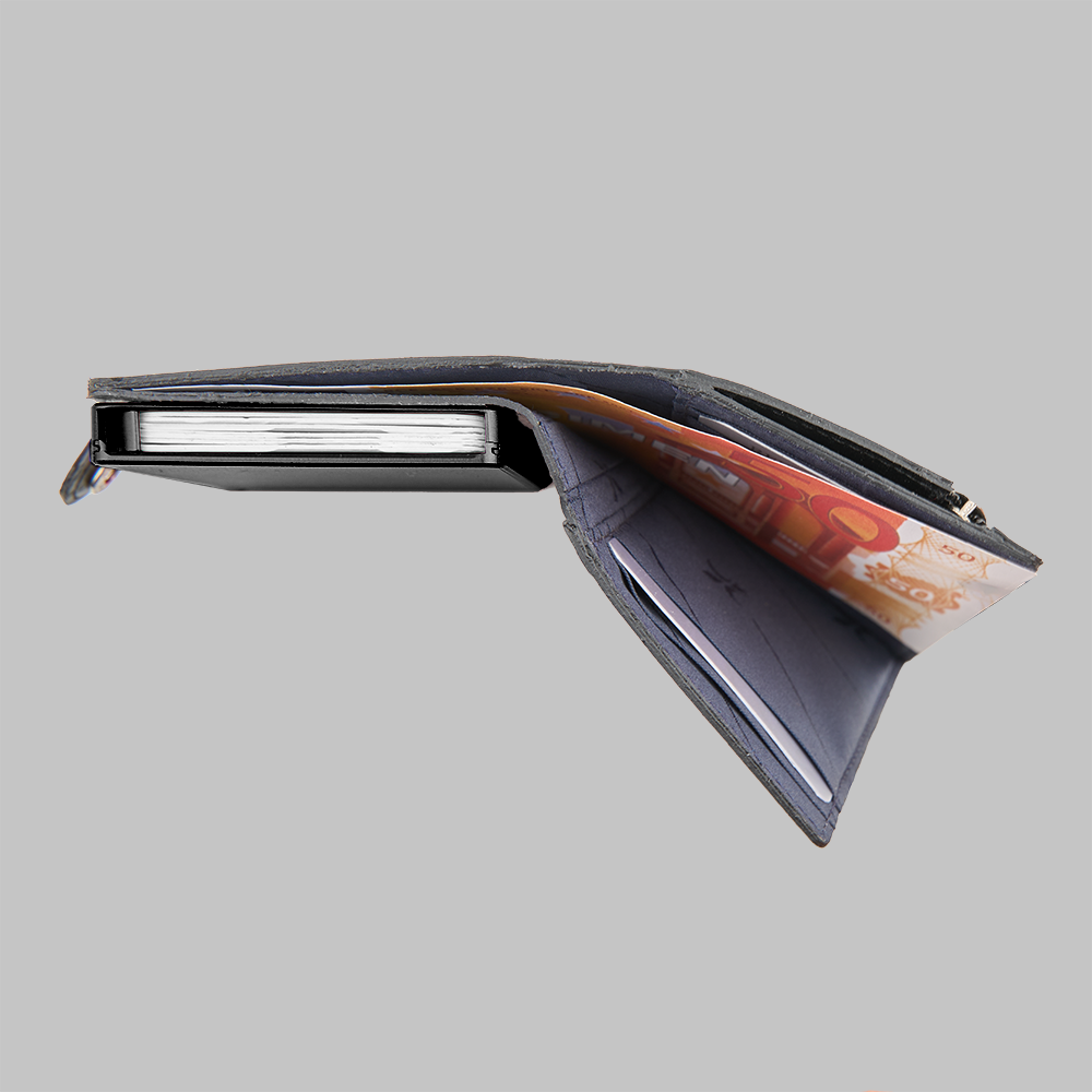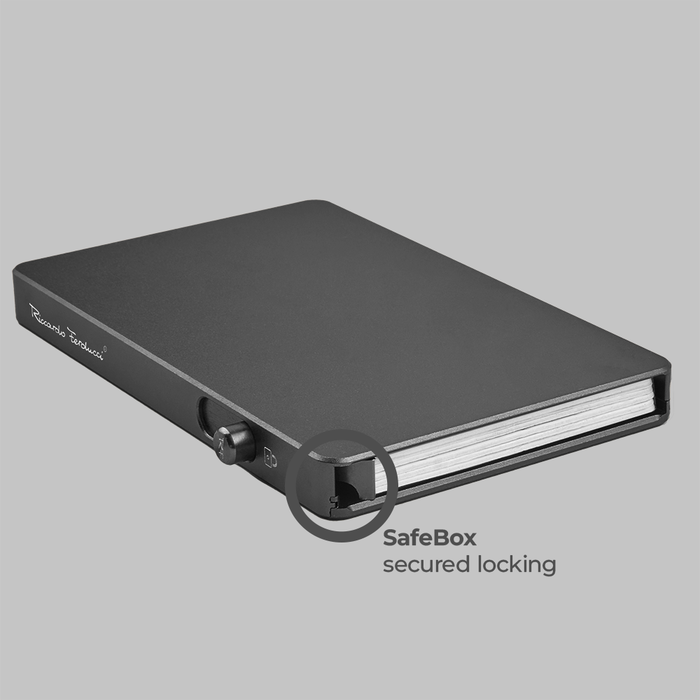 1 RFID Hacker Protection, 2 Kreditkartenfächer, 4 Kreditkartenfächer im Notenfach, 2 Steckfächer, 1 SafeBox Kartenhalter m. Lock-System 5-6 Karten, 1 Zungenverschluss m. Druckknopf, 1 Münzfach mit RV auf der Rückseite, 1 Geschenkkarton, Mit innovativem Schließsystem für maximale Sicherheit Ihrer Karten.