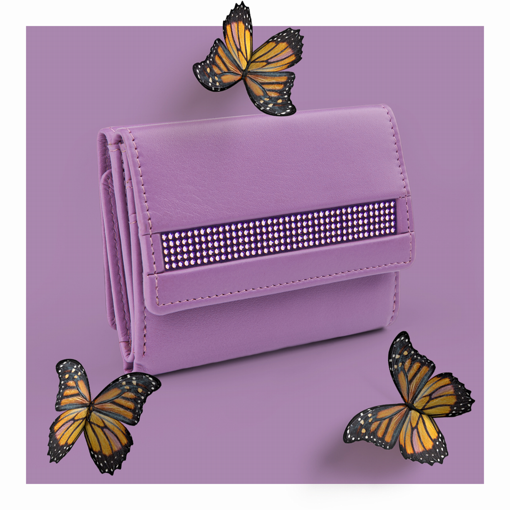 1 RFID Hacker Protection, 5 Kreditkartenfächer, 1 Münzfach, 1 Fach für Einkaufswagen-Jeton inkl. Jeton, 1 Schlüsselfach, 2 Notenfächer, verziert mit 200 Kristallen aus Österreich